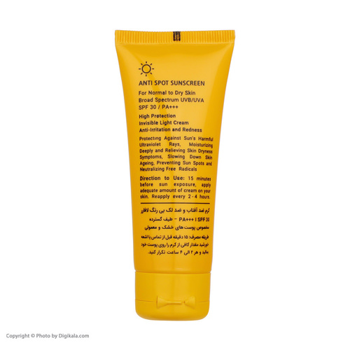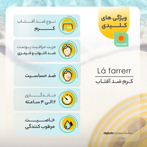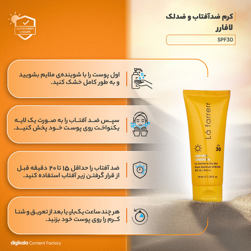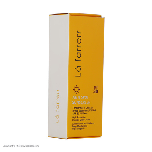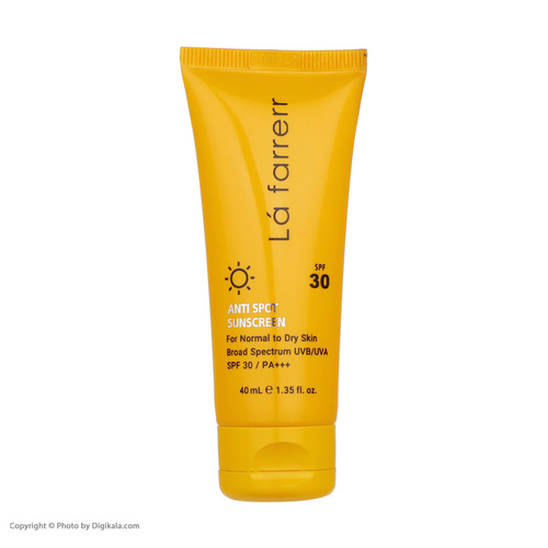 کرم ضدآفتاب و ضد لک بی رنگ لافارر مدل SPF 30 با حجم 40 میلیلیتر، یک محصول مطلوب برای محافظت از پوستهای خشک و معمولی در مقابل اشعههای مضر آفتاب است. این کرم ضدآفتاب بدون رنگ و با SPF 30 حاوی عصاره گیاهان شیرین بیان، بیربری، سارمنتوزا ساکسی فراگا، آلوئه ورا و پاپایا است. راهنمای استفاده از این کرم ضدآفتاب بسیار آسان است. باید 15 دقیقه قبل از قرار گرفتن در تماس با اشعههای مستقیم آفتاب، مقدار کافی از کرم را به طور یکنواخت بر روی پوست بزنید. همچنین، بهتر است هر 2 الی 4 ساعت تجدید این کرم ضدآفتاب را انجام دهید. این محصول ضدآفتاب محافظت کننده در برابر اشعههای UVA و UVB میباشد و با تأیید شماره مجوز 56/13550 از سازمان غذا و دارو ارائه شده است. این کرم متناسب با پوستهای خشک و معمولی بوده و دارای ویژگیهای جذابی همچون مات کننده پوست، خنثی کردن رادیکالهای آزاد، ضد حساسیت، شفاف کننده پوست، ضد چروک و ضد لک میباشد. همچنین، جلوه رنگ مات، جنس محفظه پلاستیکی و نوع محفظه تیوپی از ویژگیهای این کرم ضدآفتاب است.